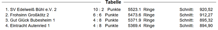 Rückrunde 1 – 2:0 gegen Bühl (911,4 zu 911,2 Ringe)